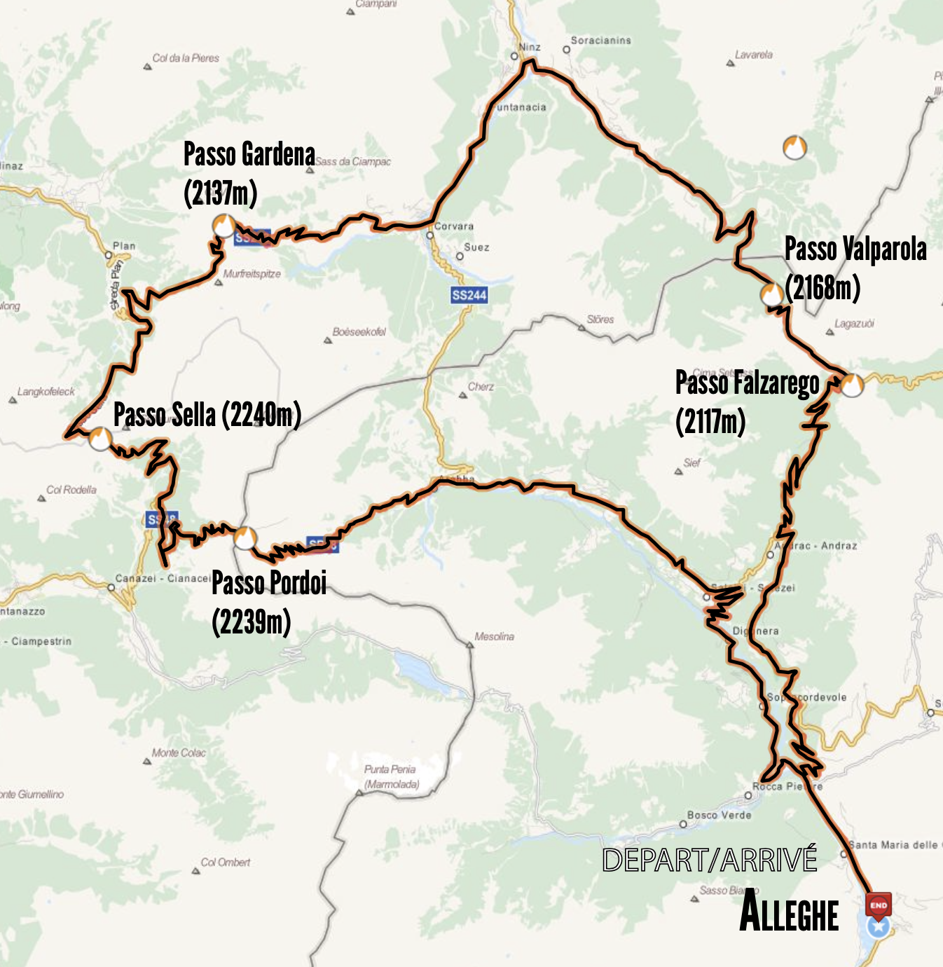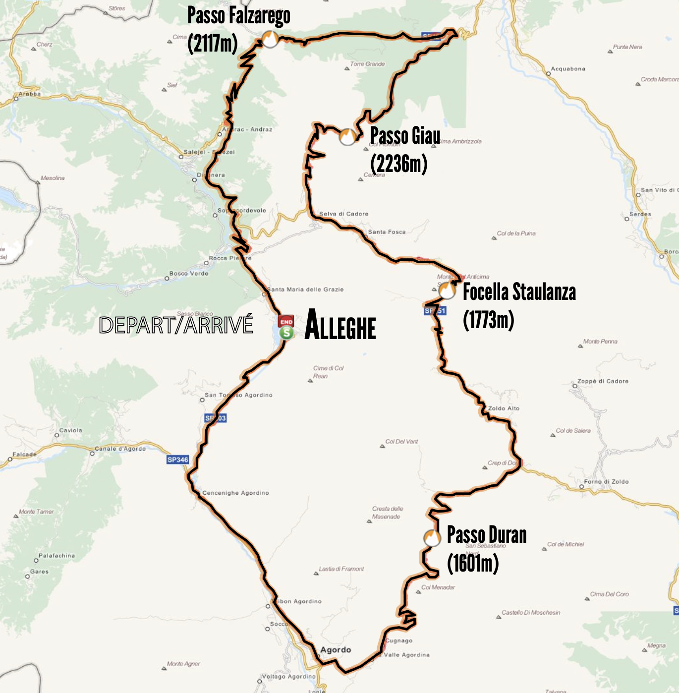 Passo Duran (1,601m), Forcella Staulanza (1,773m), Passo Giau (2,236m), Passo Falzarego (2,117m)